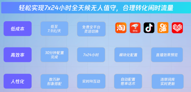 通过大约30分钟的后台配置,商家即可在淘宝、京东、抖音、快手、拼多多5大主流电商直播平台实现7*24小时自动直播,这也是“蓝标智播”独家的优势所在:我们知道,李佳琦只能在一个固定平台卖货,“蓝标智播”直播间产品出现后,虚拟主播则能实现在不同的平台卖货,主播也能“分身有术”了;退一步说,就算李佳琦也能在5个平台同时卖货,但一个人的精力总是有限的,这样多干几次李佳琦估计很快就会累了,而“蓝标智播”则根本就不用“轮岗”,可以实现在直播间全天无休的卖货。